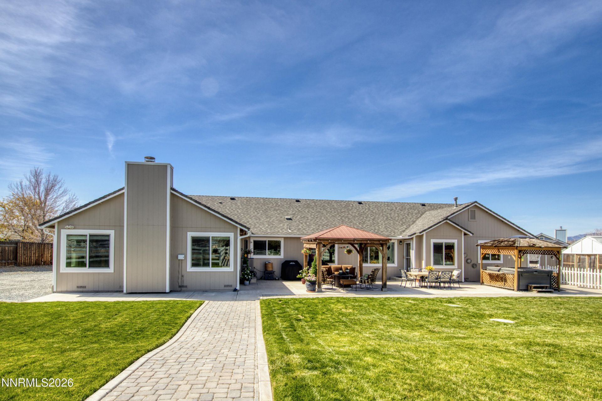 Experience refined country living in the prestigious Bridle Path equestrian community. Set on 5 fully usable acres, this exceptional single-story estate offers 3,044 square feet of thoughtfully designed living space surrounded by mature trees, open skies, and sweeping equestrian grounds. Designed for the equestrian enthusiast, the property features an impressive 6 stall MD Barnmaster Breezeway barn with attached 12' x 36' covered patio which includes a wash rack and hitching posts, private arena, grass pastures, two large outdoor corrals with lean tos, hitching posts, and multiple outbuildings. Direct access to Bridle Path's scenic riding trails enhances the lifestyle appeal. The grounds are equally impressive, showcasing over 40 mature trees, five varieties of fruit trees, a greenhouse, chicken coop, spa, gazebo, and a 5-hole putting green. A drive-through RV port, tractor, and Yamaha Rhino ATV provide added convenience and functionality. Inside, the home showcases slab granite countertops and backsplash, double ovens, remodeled bathrooms, and a warm & cozy double-sided fireplace. Additional highlights include a newer roof, solar servicing both the home and barn, and an electric vehicle outlet. A rare 5 acre offering combining privacy, luxury, and premier equestrian amenities in one of Northern Nevada's most sought-after communities. Conveniently located near shopping, restaurants, medical facilities, Costco, Home Depot, and local fire departments, this property offers the perfect balance of peaceful country living with easy access to everyday amenities. All photos are in the virtual tour link. For additional details, please refer to the features and upgrades list.